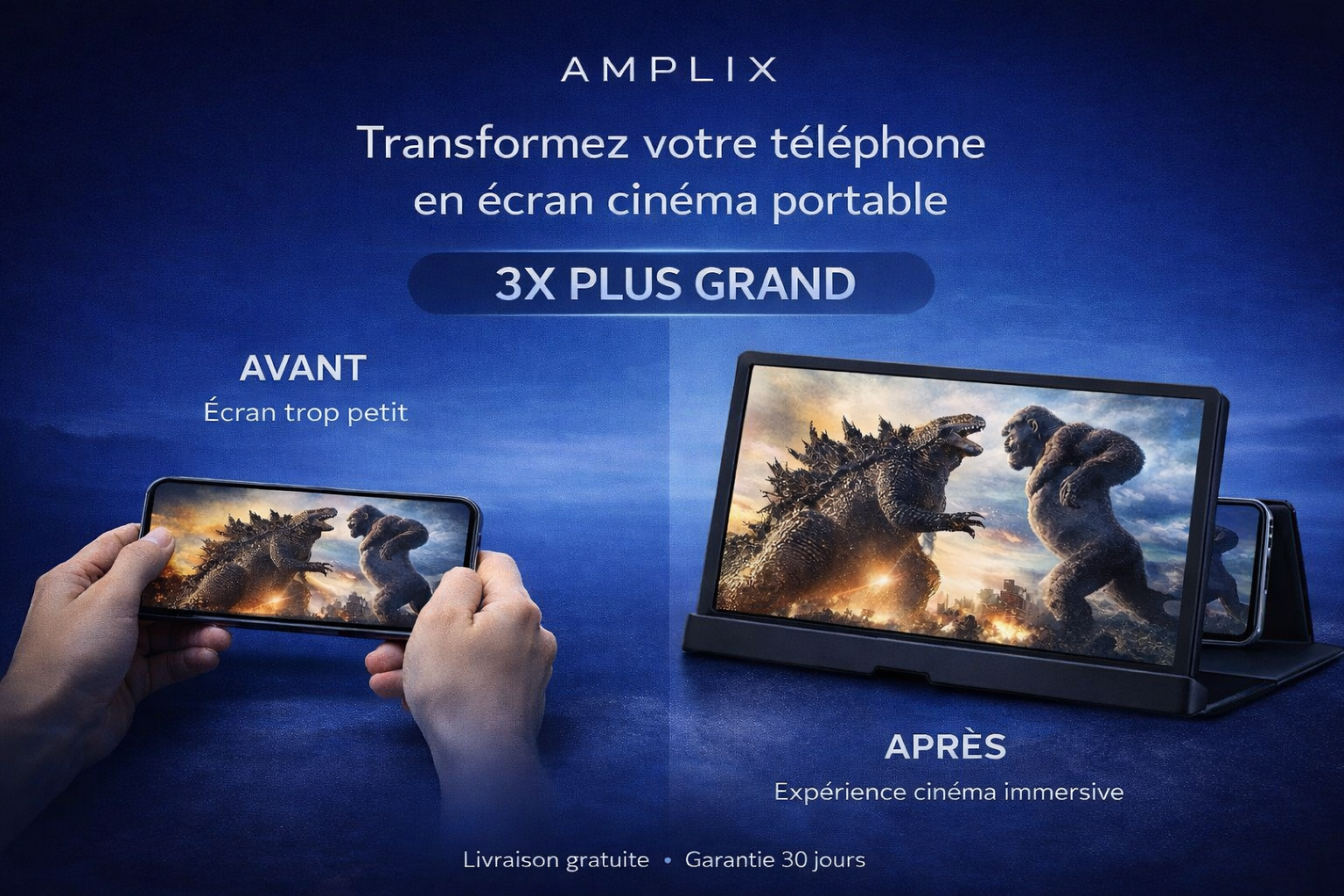 Transformez votre smartphone en mini écran grand format en quelques secondes. Cet amplificateur d’écran pliable agrandit l’image de votre téléphone pour profiter plus confortablement de vos séries, vidéos, appels et lectures, sans application et sans batterie.